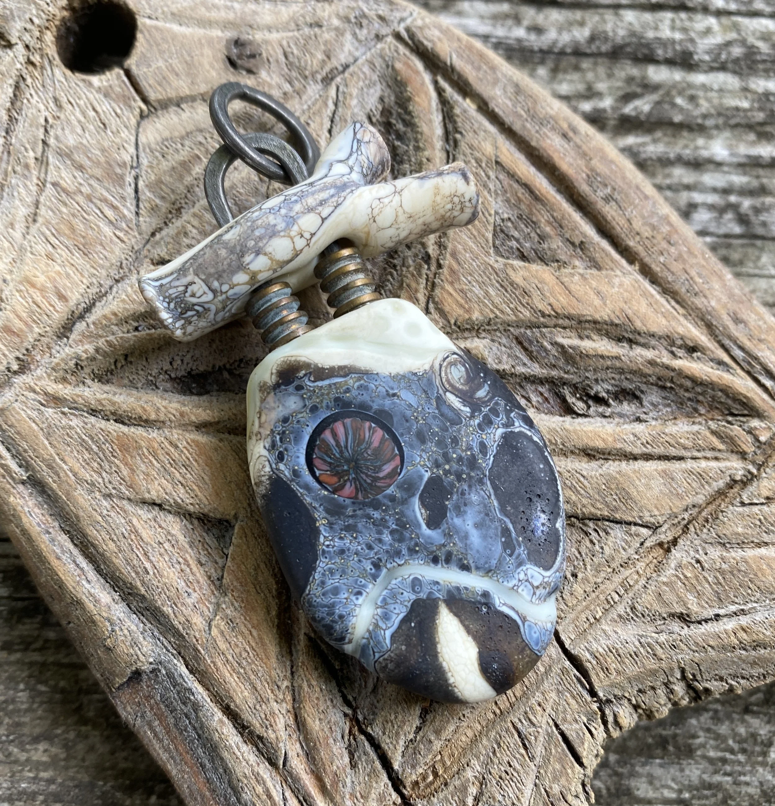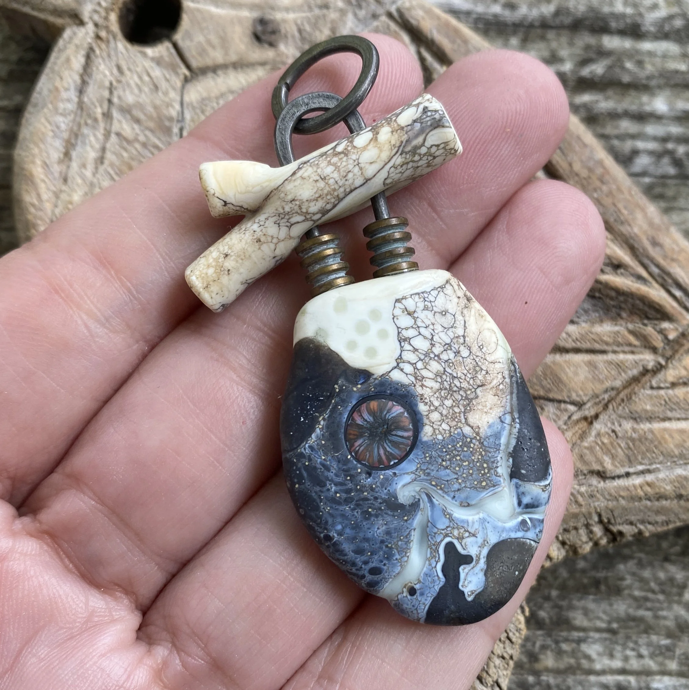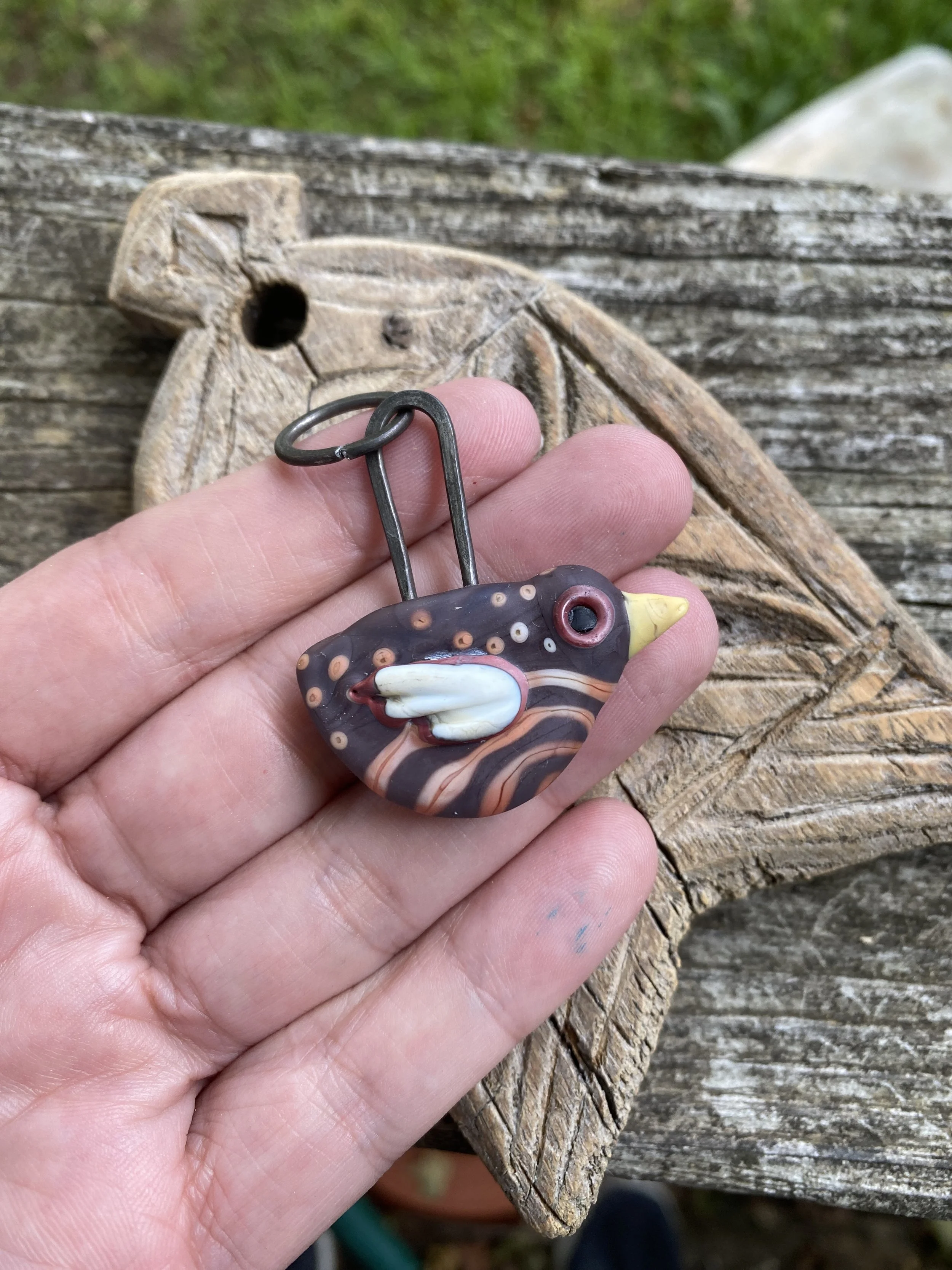 Ivory crow in dusty Plum pants. and murrini belt buckle. A bit of devitrification on the pants. Solid, but dusty.(thus the 10.00 discount) Measures 40 × 48mm. Acid Etched.