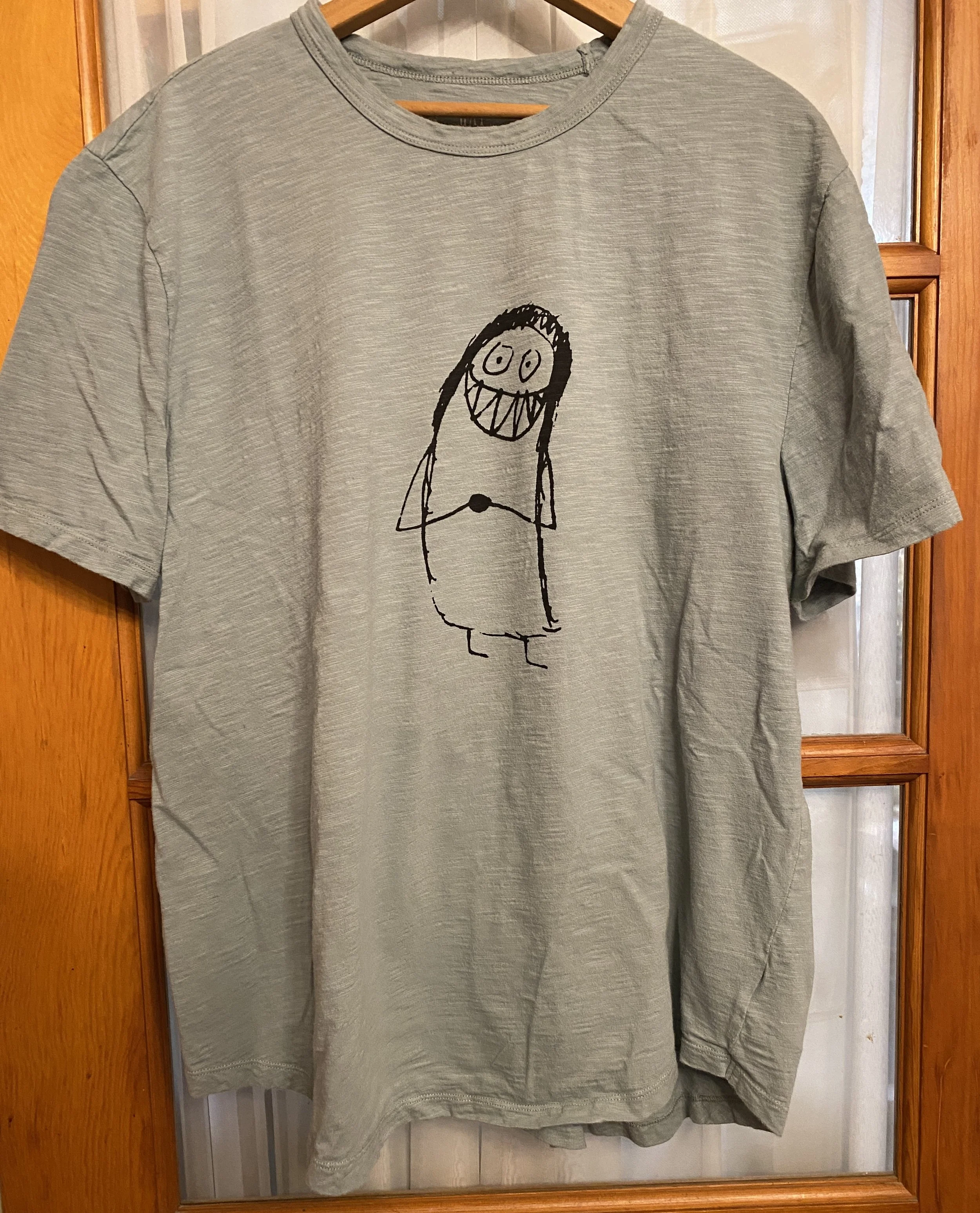 This guy, within my family, is called the Gratitude Monster. He was originally a sketch by my kiddo Max. We think he is clearly saying “ OMG! Thank you SO much!!” He’s kind of a big deal around here, and I’ve decided to start hand silkscreening his happy silly self onto some thrifted shirts, and offering them up on my website. The Gratitude Monster prefers to hang out on a nice, soft, lived in shirt, because they’re the coziest. There will be an assortment of sizes and shirt colors. Each is one-of-a-kind. As I love to upcycle, and try and keep these shirts out of the landfill, and give them a second life.