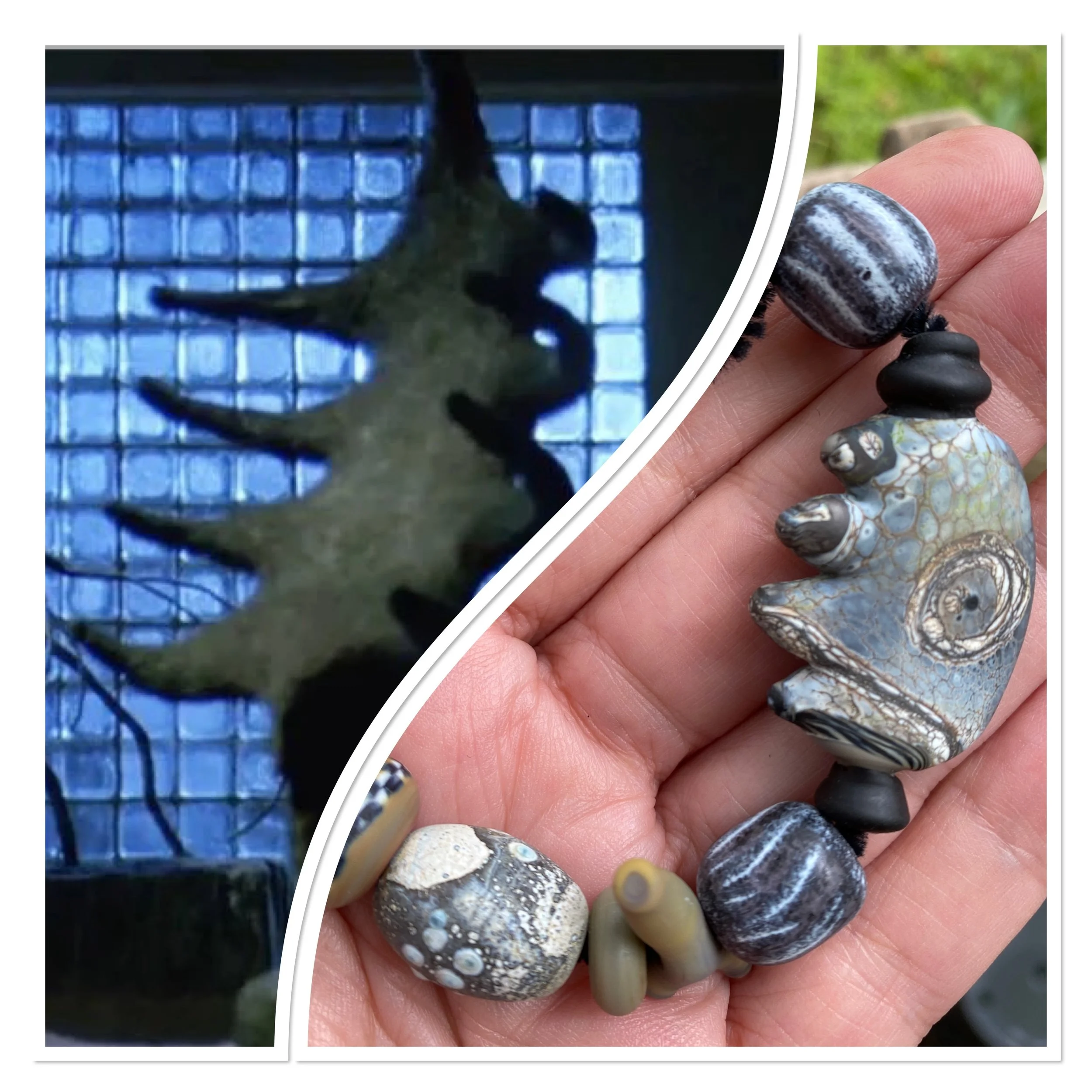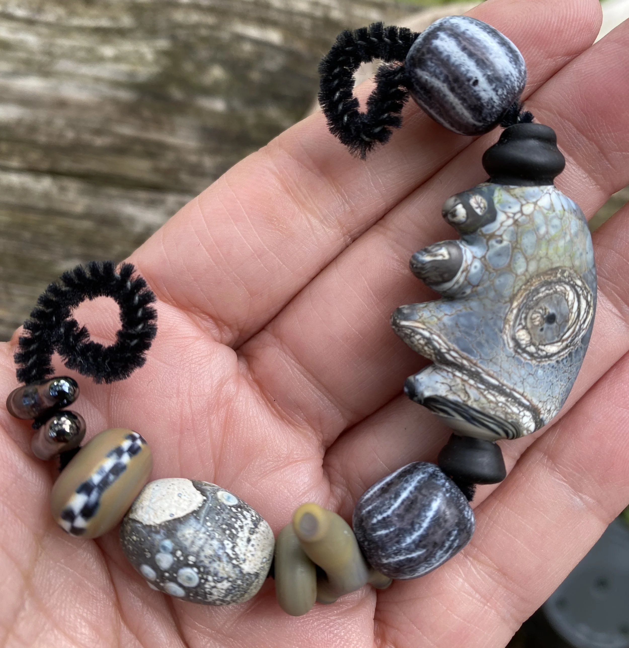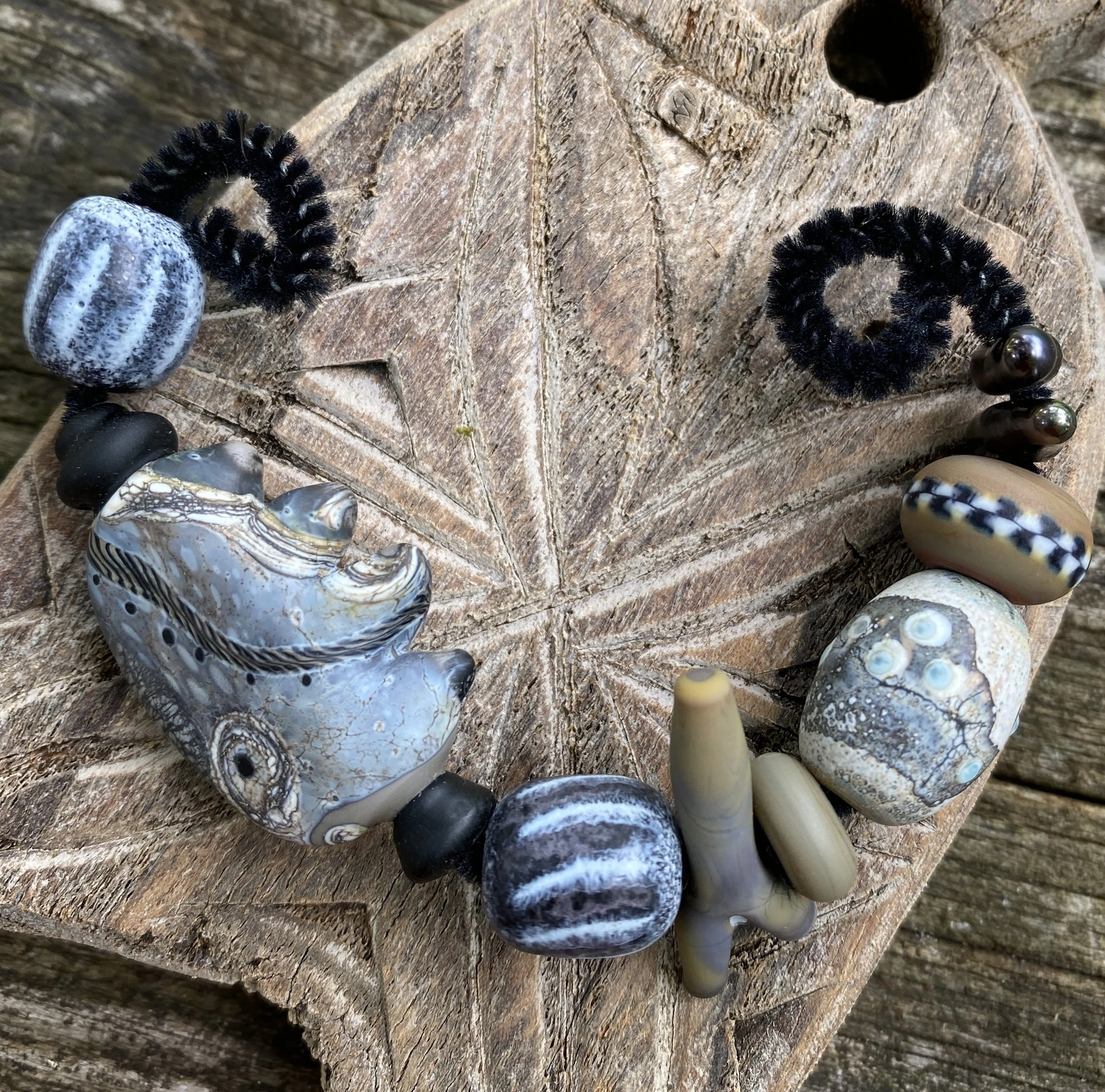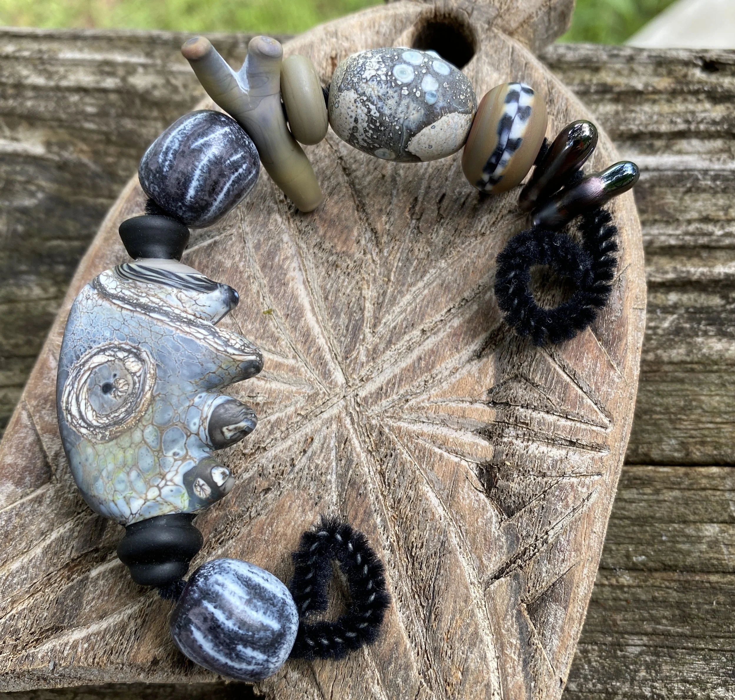 Beetlejuice - bead set - Set of 9 beads. includes 1 freeform tabular bead, 2 stripey ovals, 1 organic barrel, 1 twig, 1 checkerboard round, 1 taupe spacer, and 2 sticky-outy metallics. Freeform Tabular bead measures 28 × 40mm.