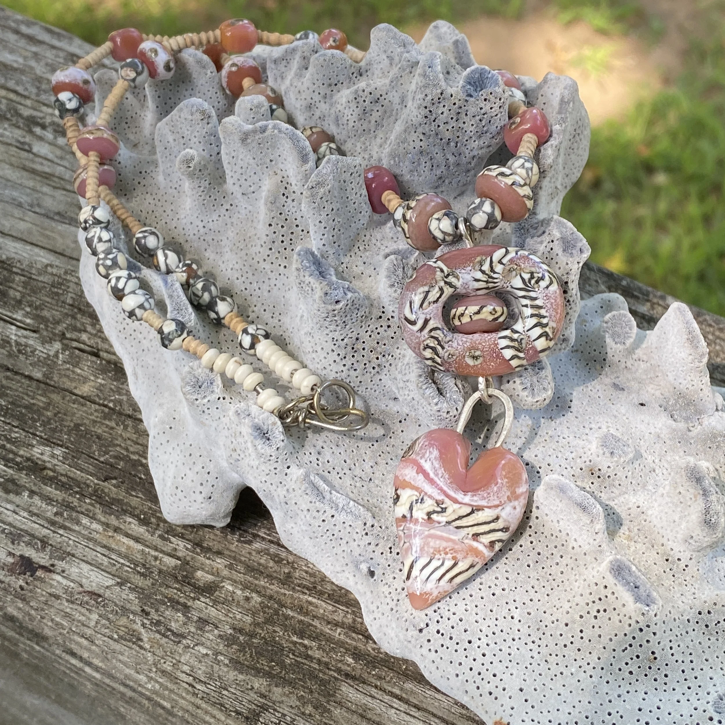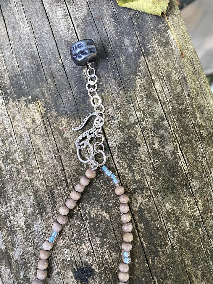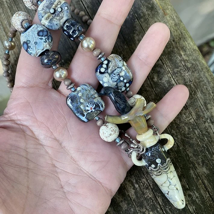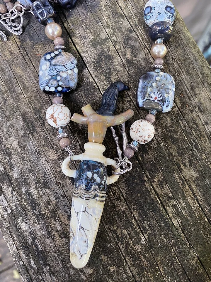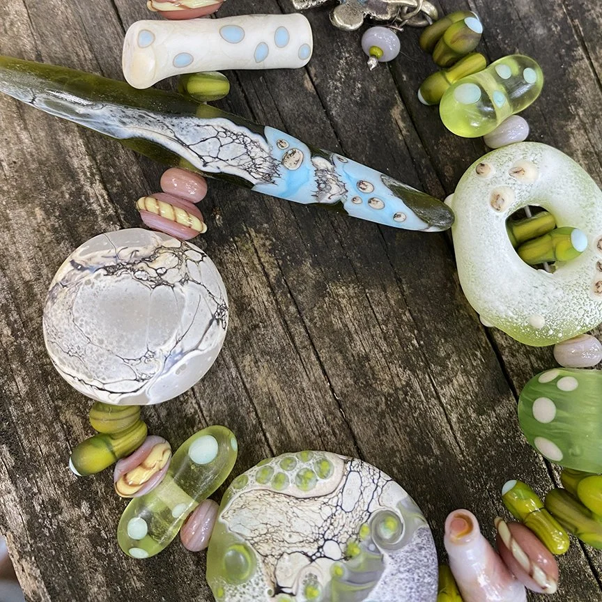 Beetlejuice - bead set - Set of 9 beads. includes 1 freeform tabular bead, 2 stripey ovals, 1 organic barrel, 1 twig, 1 checkerboard round, 1 taupe spacer, and 2 sticky-outy metallics. Freeform Tabular bead measures 28 × 40mm.