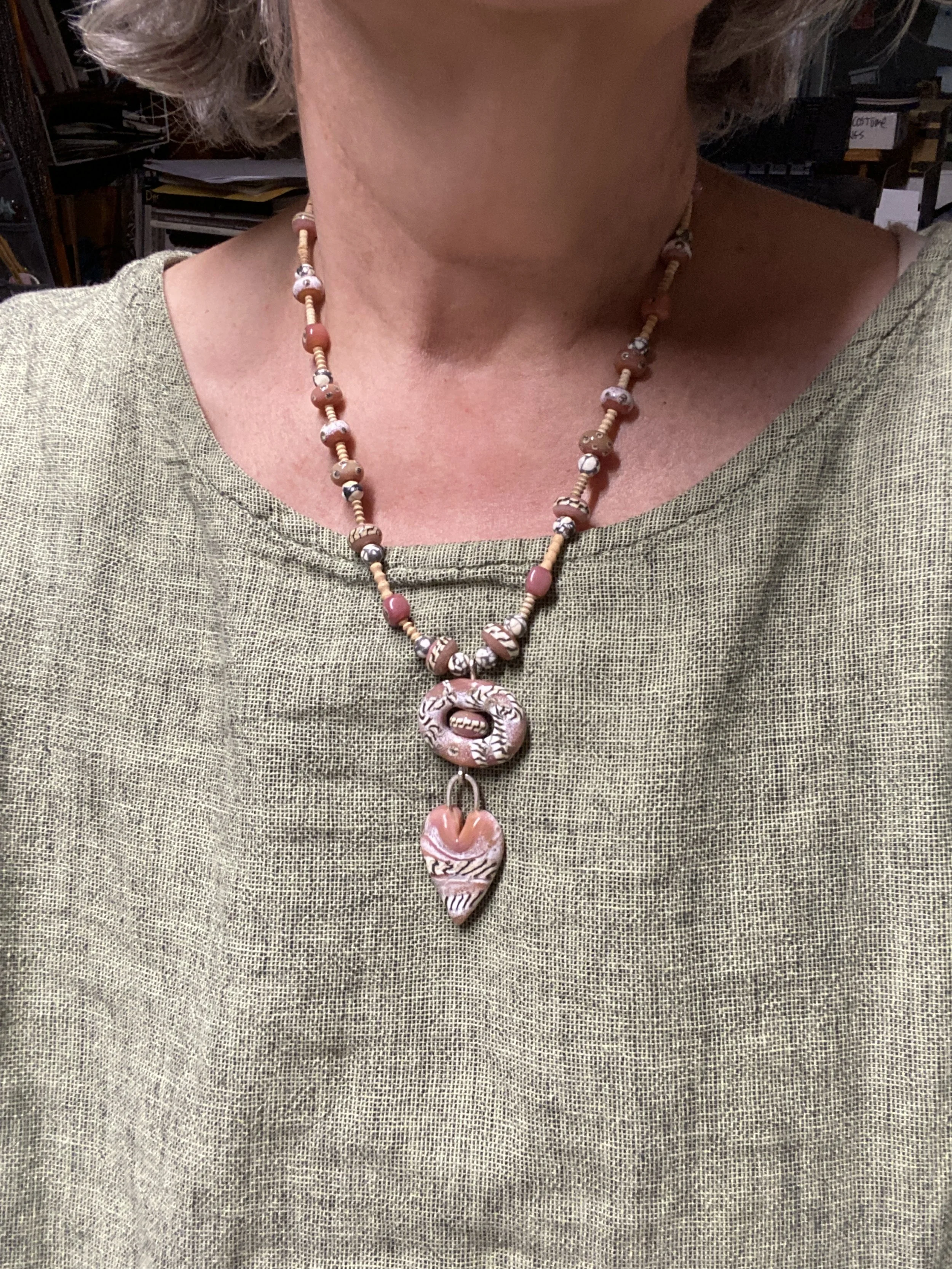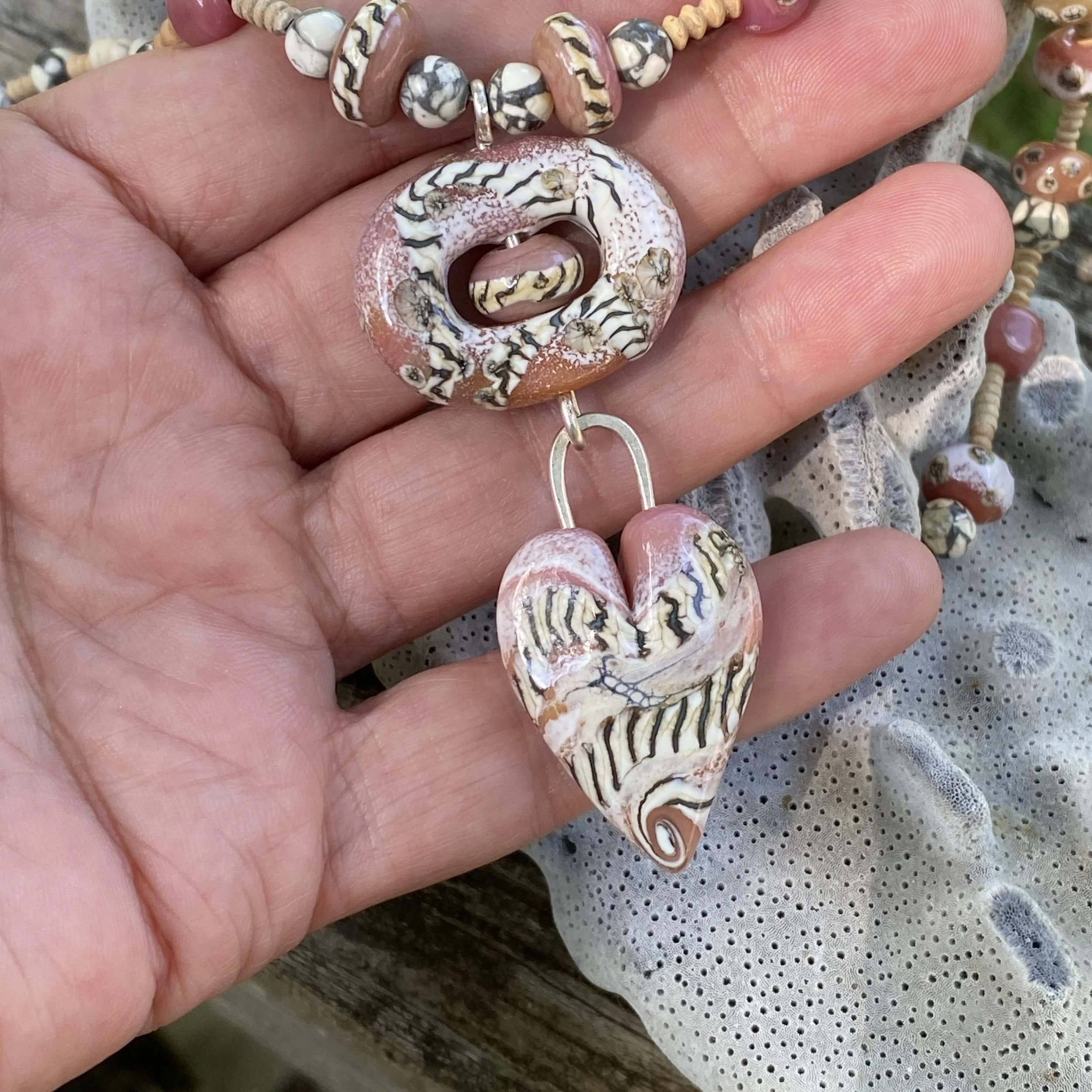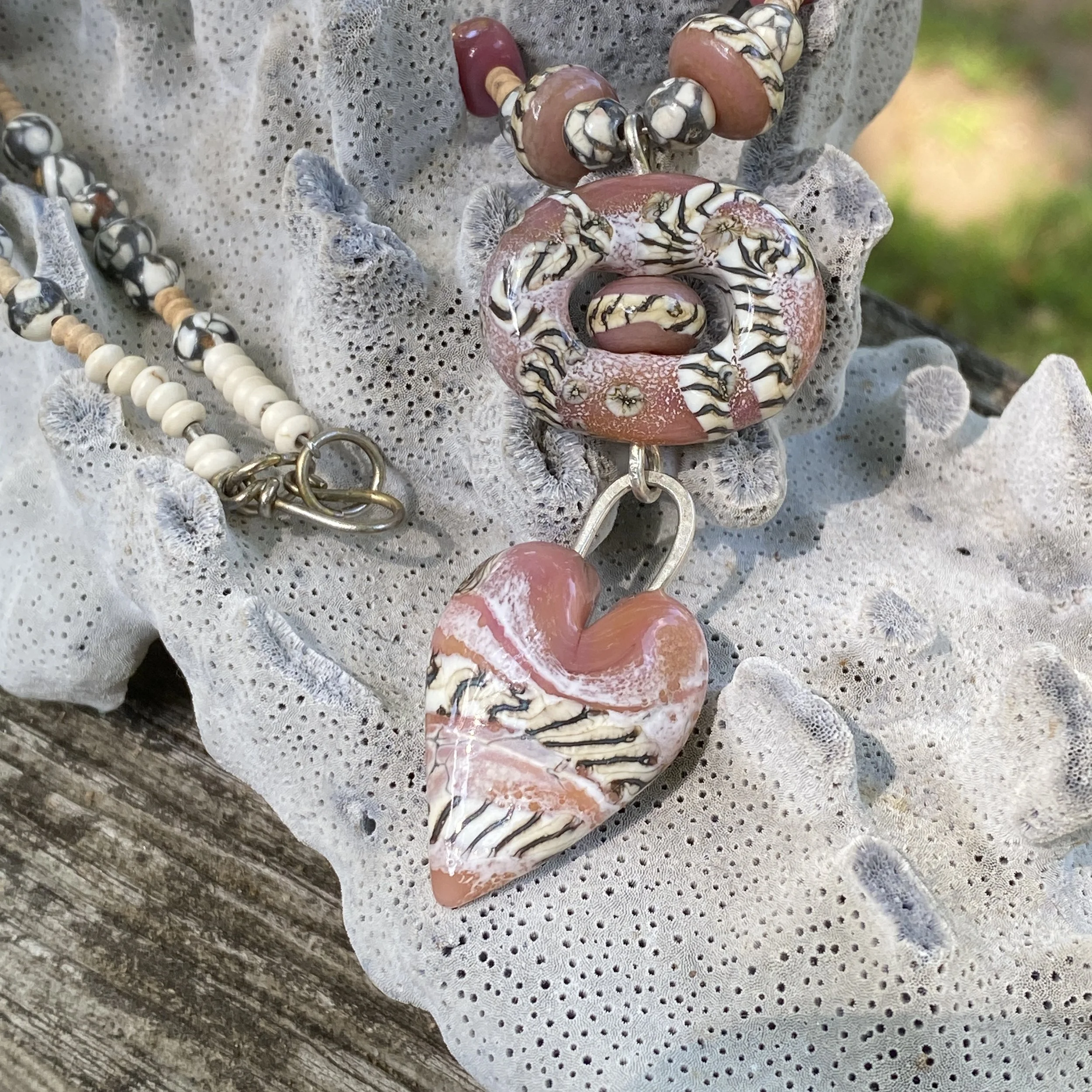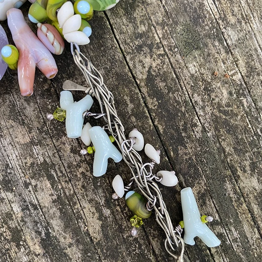 Beetlejuice - bead set - Set of 9 beads. includes 1 freeform tabular bead, 2 stripey ovals, 1 organic barrel, 1 twig, 1 checkerboard round, 1 taupe spacer, and 2 sticky-outy metallics. Freeform Tabular bead measures 28 × 40mm.