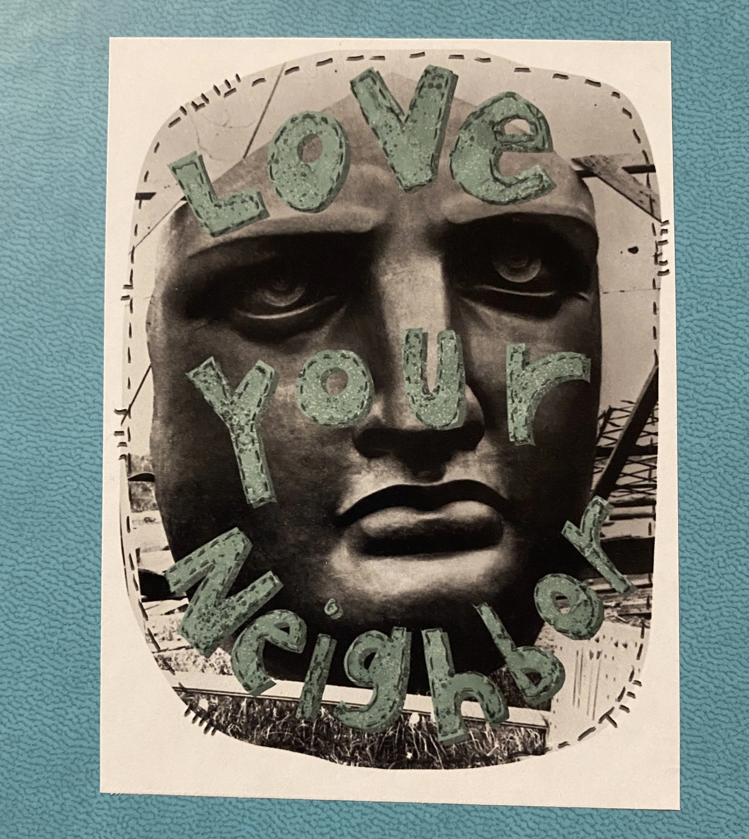 Lady Liberty’s face behind the reminder to Love Your neighbor.
